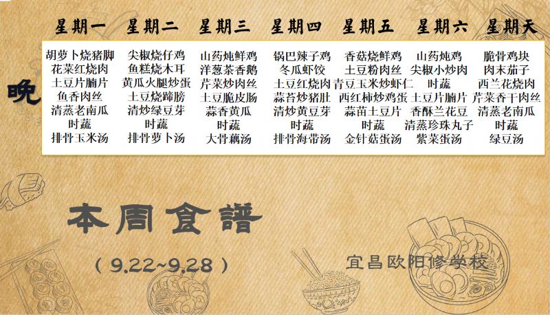 宜昌歐陽(yáng)修學(xué)校每周食譜(9月22日-9月28日)